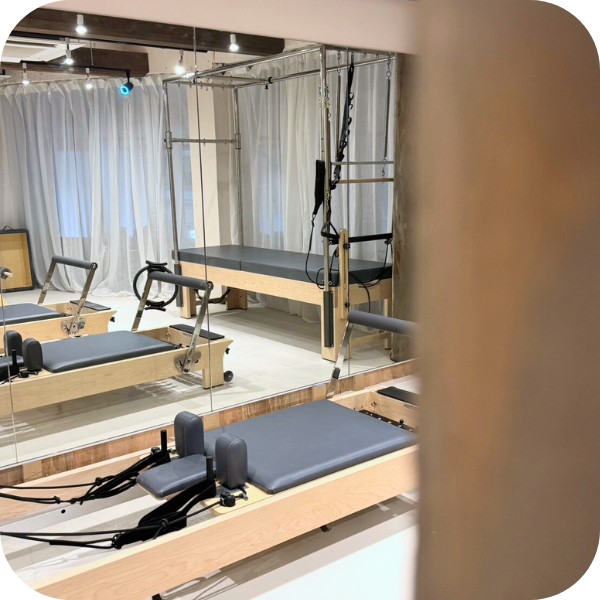 マシン×マンツーマンで、呼吸・姿勢・コアの使い方から丁寧に。強度はその場で調整。無理なポーズや痛みを伴う動作は行いません。